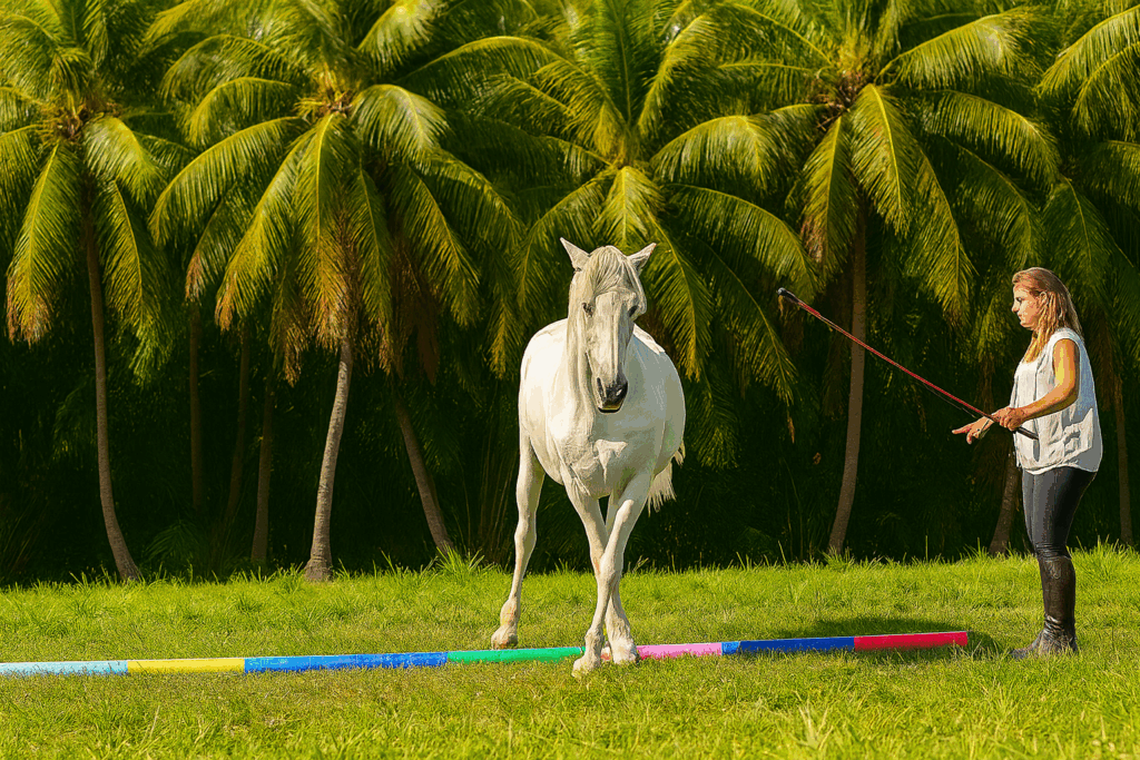 Le poney ou cheval est muni d’un surfaix et d’un tapis spacieux, ce qui permet aux voltigeurs de réaliser une variété de figures mettant pleinement à l’épreuve leur équilibre et leurs capacités physiques.